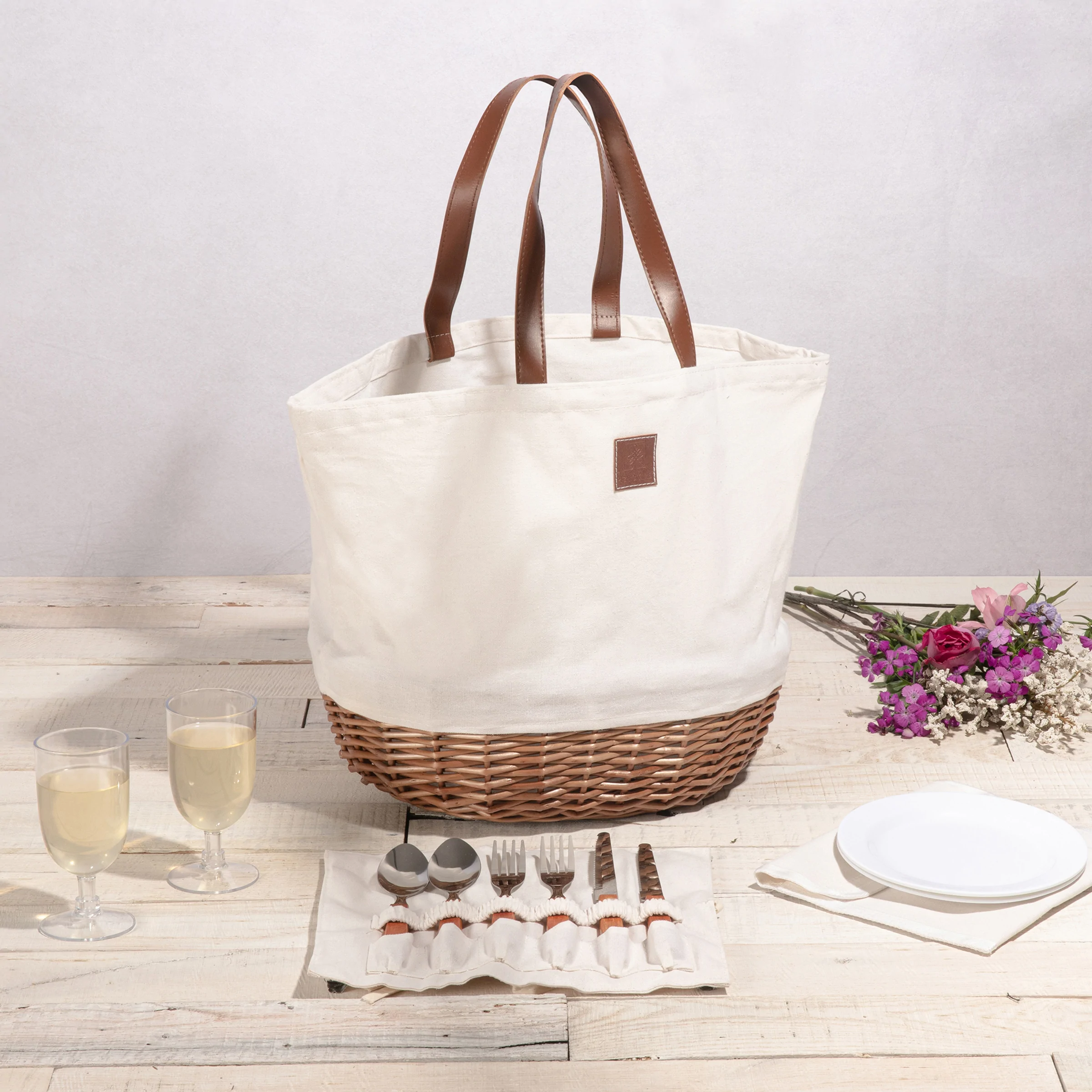 The ideal solution to the dilemma between picnic baskets and totes is Picnic Time’s Promenade Picnic Basket for 2. This wine and cheese tote features a complete picnic set for two, giving you the best of both worlds. The basket comes equipped with 2 plates, 2 wine glasses, utensils with wooden handles, and pouches to protect your snacks. Measuring 11.4″ x 13.4″ x 14.75″, it has stylish leatherette handles and is a perfect gift for special occasions like anniversaries or weddings.