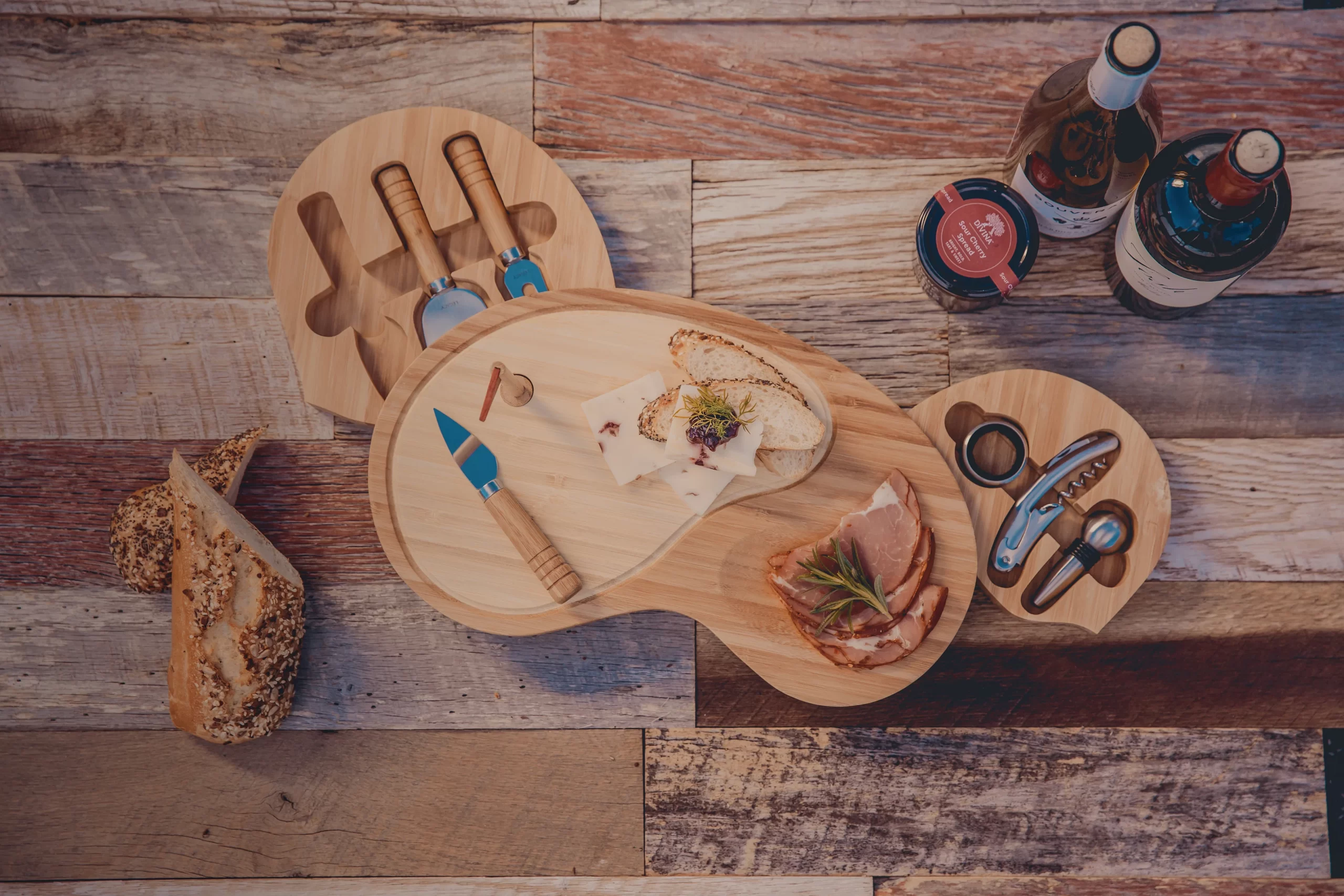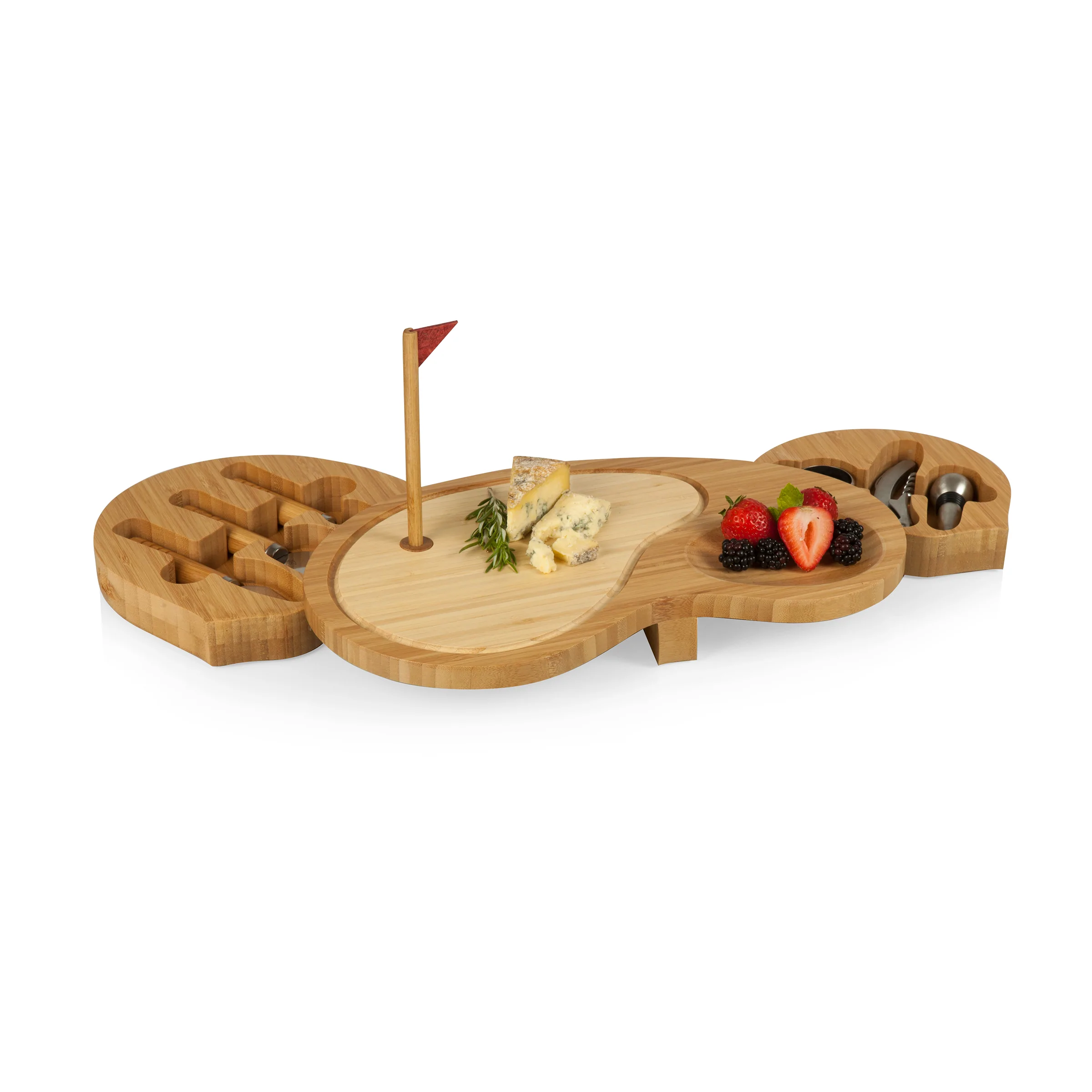 Toscana, a brand by Picnic Time, presents the Sand Trap cheese board and tool set, crafted from solid bamboo and designed as a putting green. The cheese board features swing-out drawers under it to access the wine and cheese tools, including a cheese fork, a hard cheese knife, and a cheese chisel knife with golf club grip-style handles. Additionally, the set includes wine accessories in brushed stainless steel, such as a waiter-style corkscrew, a knob-style bottle stopper, and a drip ring.